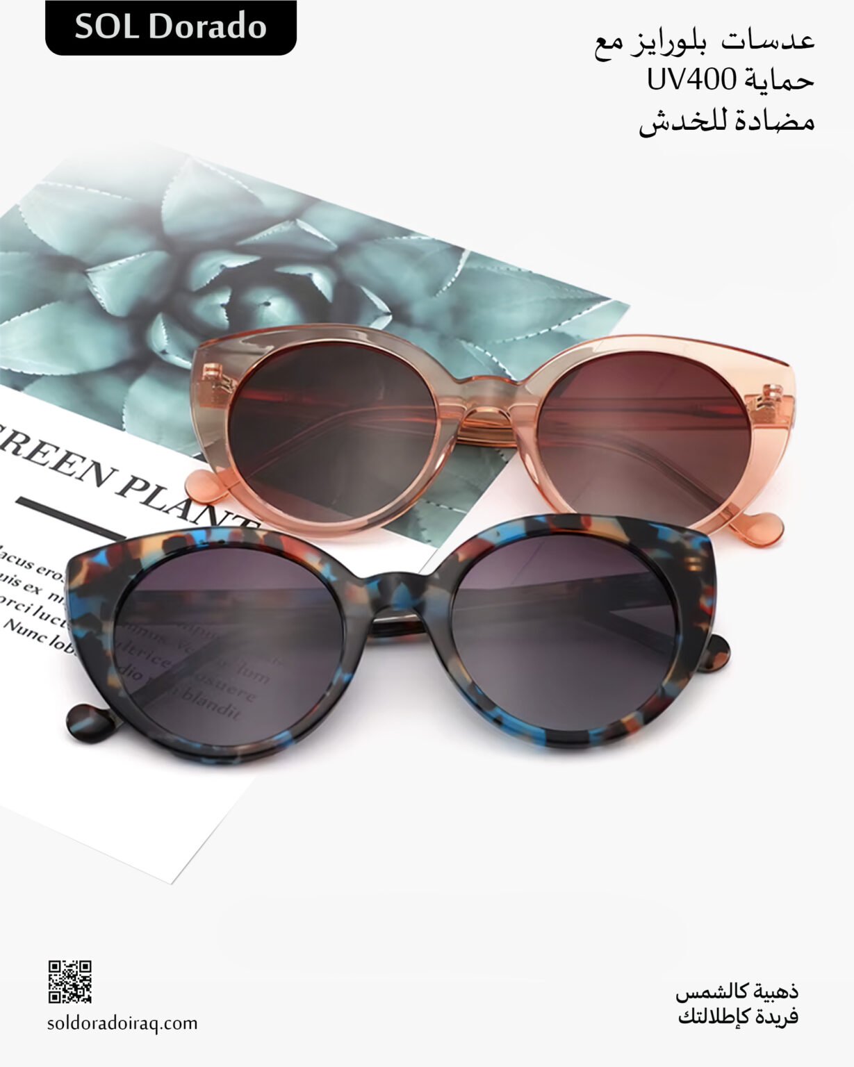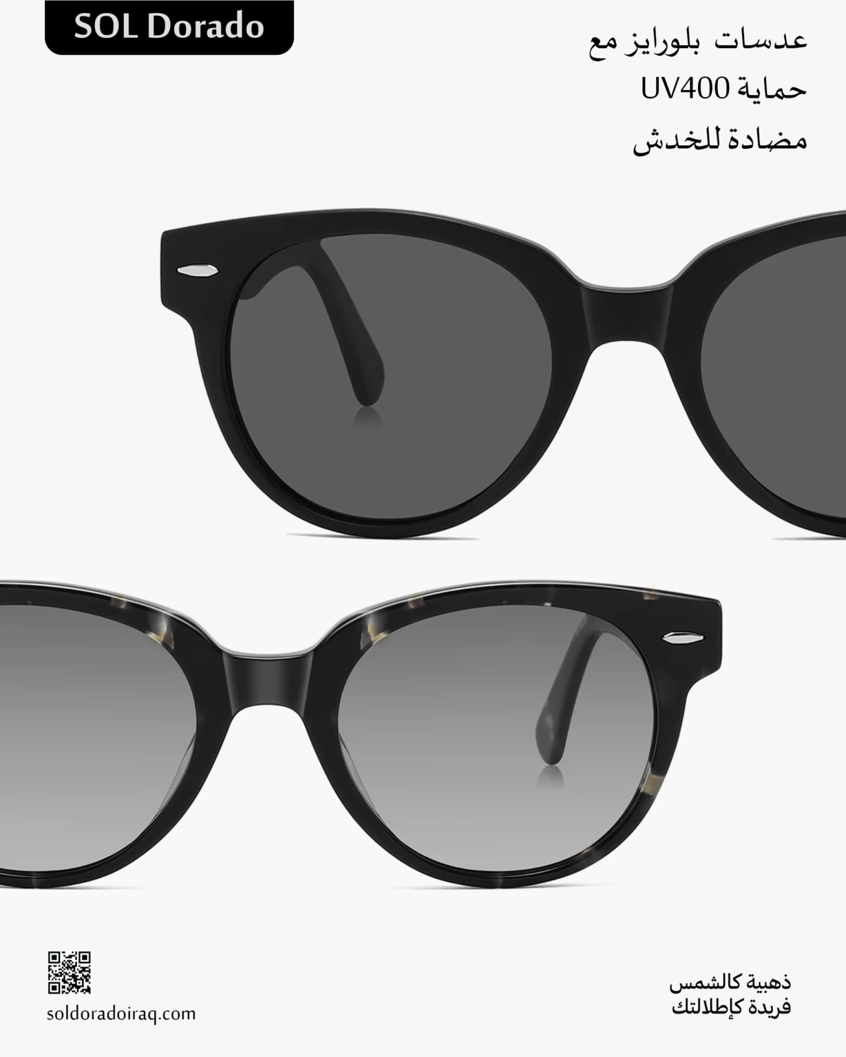 نحن نفتخر بكوننا براند عراقي يقدم أحدث النظارات الشمسية الفاخرة التي تجمع بين الأناقة والجودة والحماية. تُصنع تصاميمنا من أفضل المواد لتمنحك راحة عالية ومتانة طويلة المدى مع حماية كاملة من الأشعة فوق البنفسجية. اختر التميّز… اختر Sol Dorado.